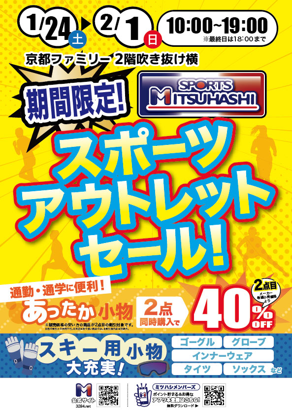 【催事のお知らせ】1/24(土)より!京都ファミリーにて!冬の防寒アイテムがお得にそろう!アウトレットセール開催⛷️✨