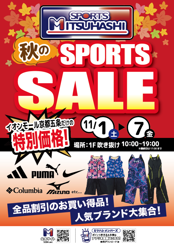 【催事のご案内】11/1(土)より!🍁イオンモール京都五条にて🍁秋のSPORTS SALE開催!