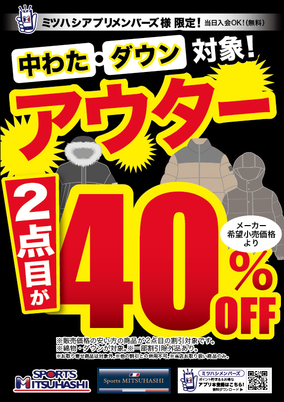 \対象店舗にて/12/12(金)より!冬アウター2点目《40%OFF》!まとめ買いが一番お得な4日間!